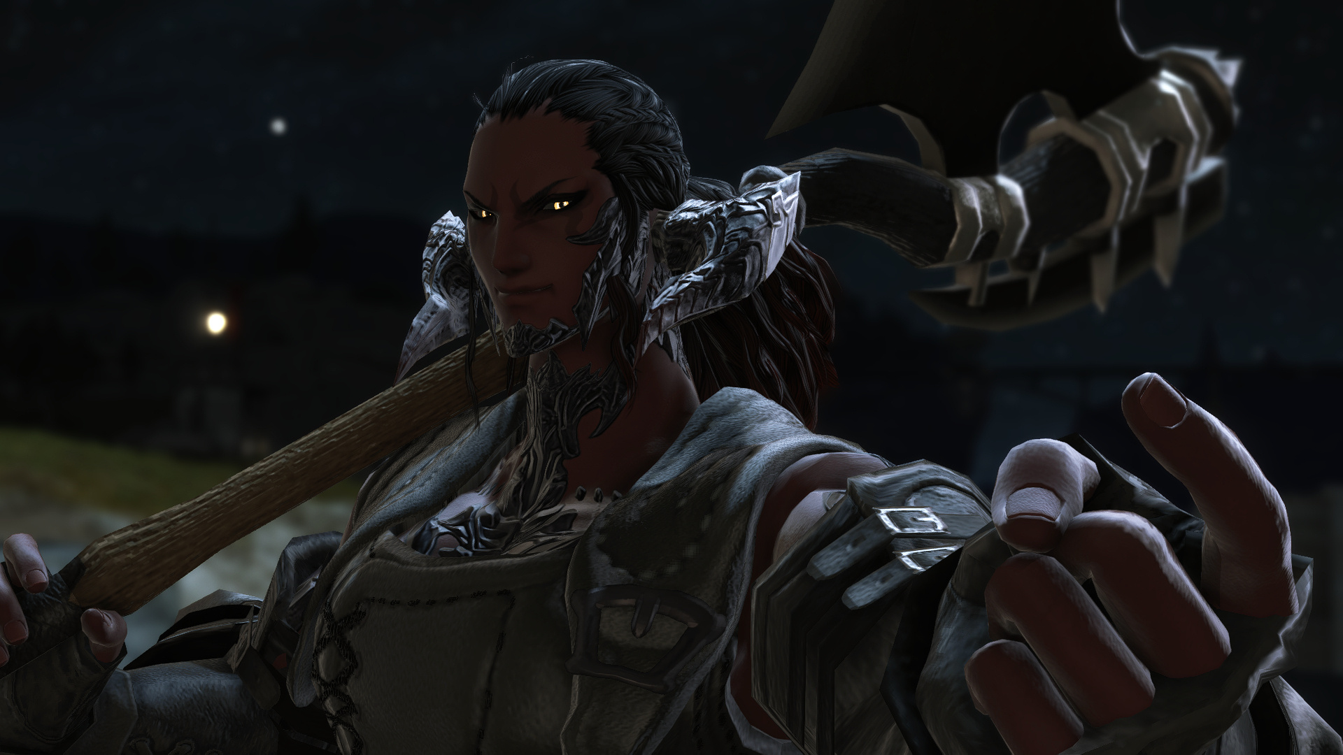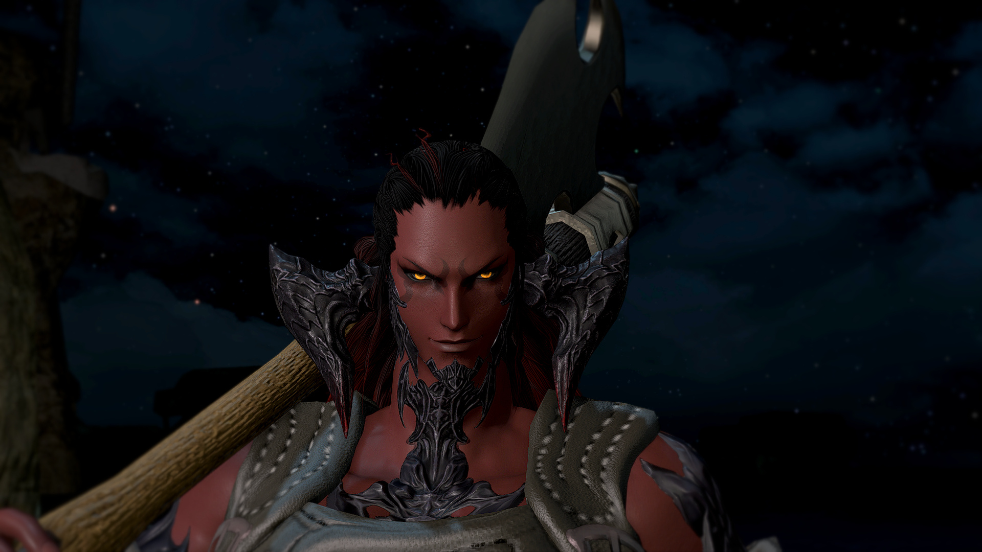 This Xaela carries a huge greataxe, and knows how to use several other weapons, though the bigger one is his weapon of choice. If you're an axe enthusiast or a blacksmith, he might be interested in your services.