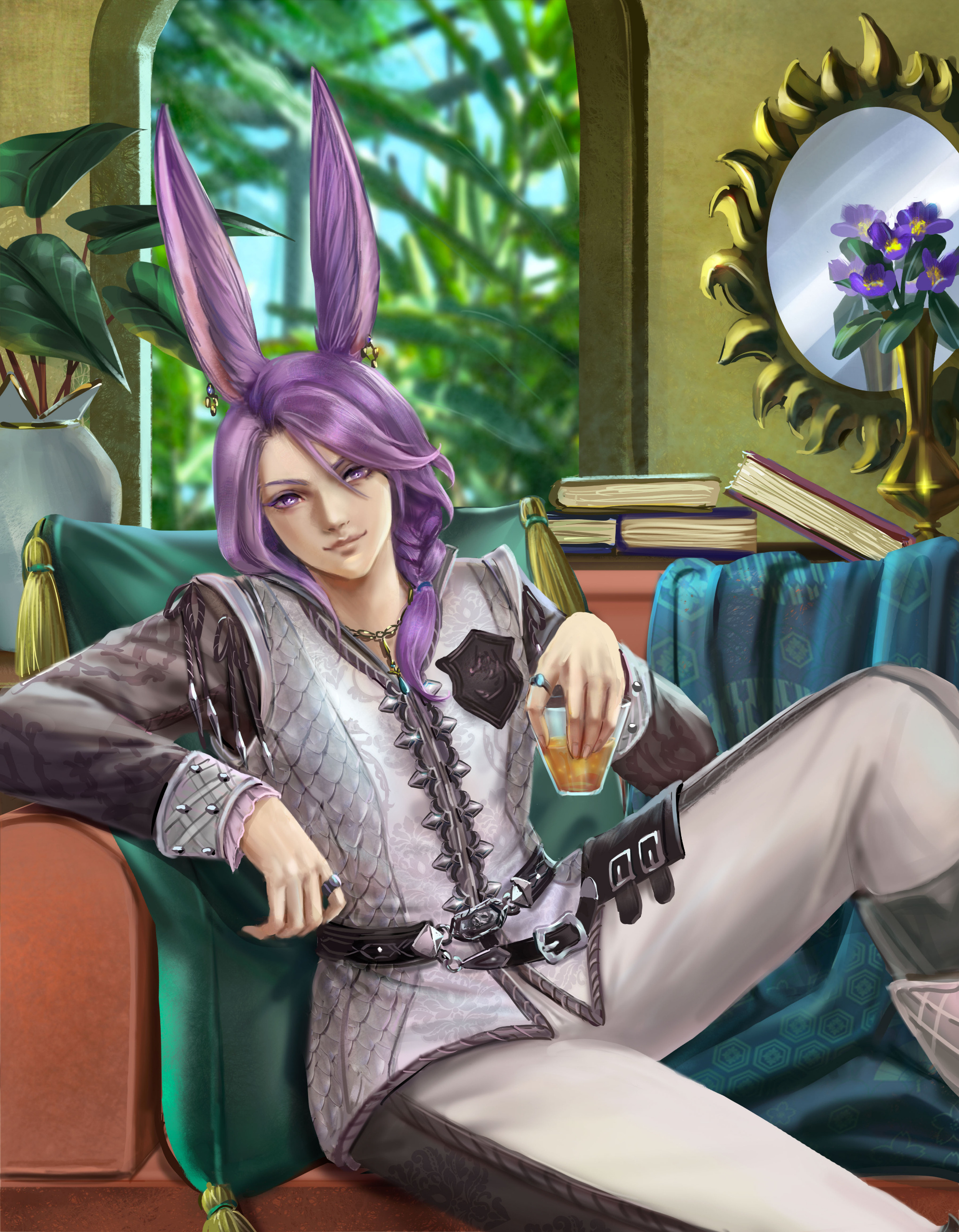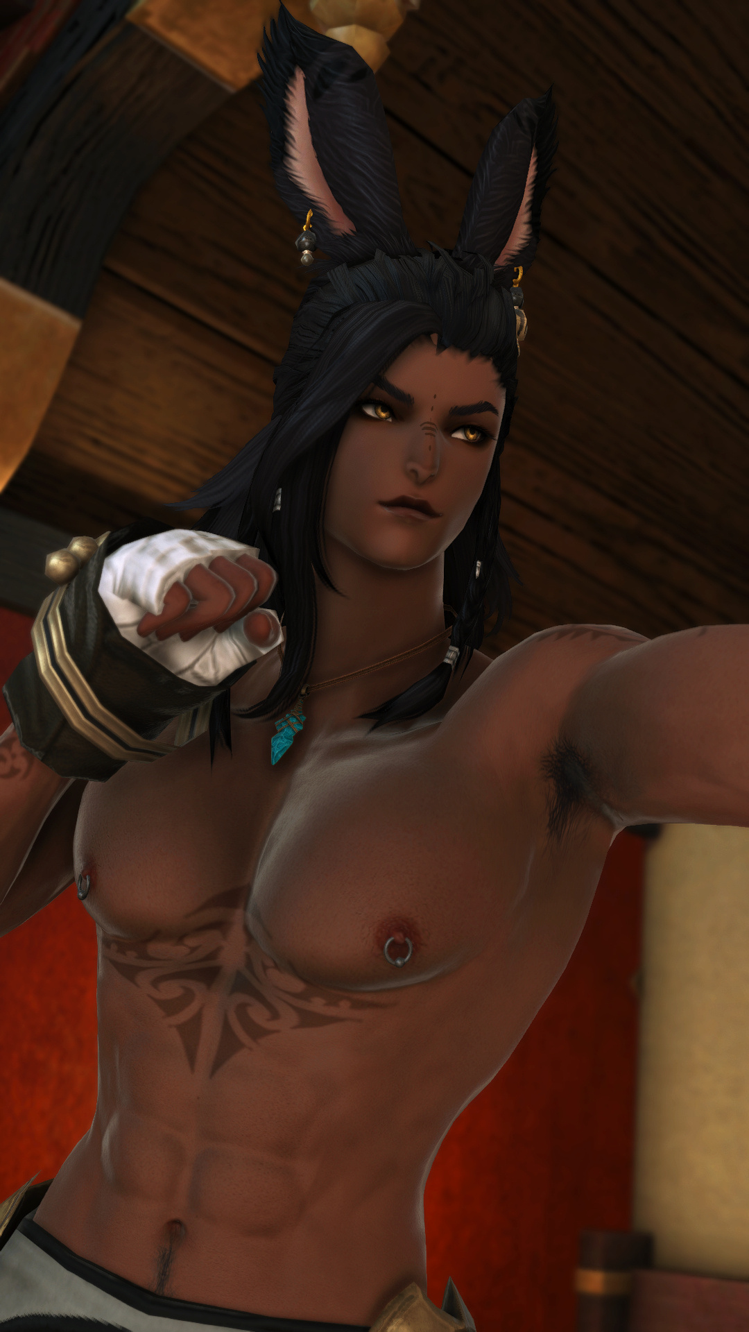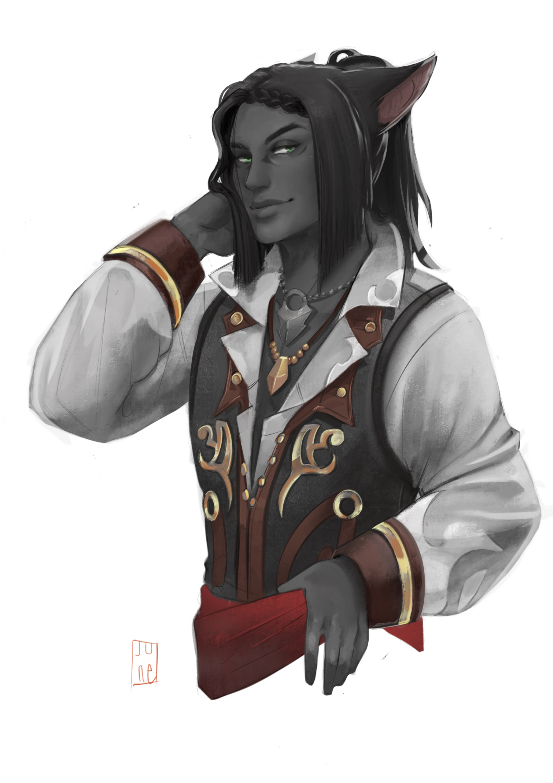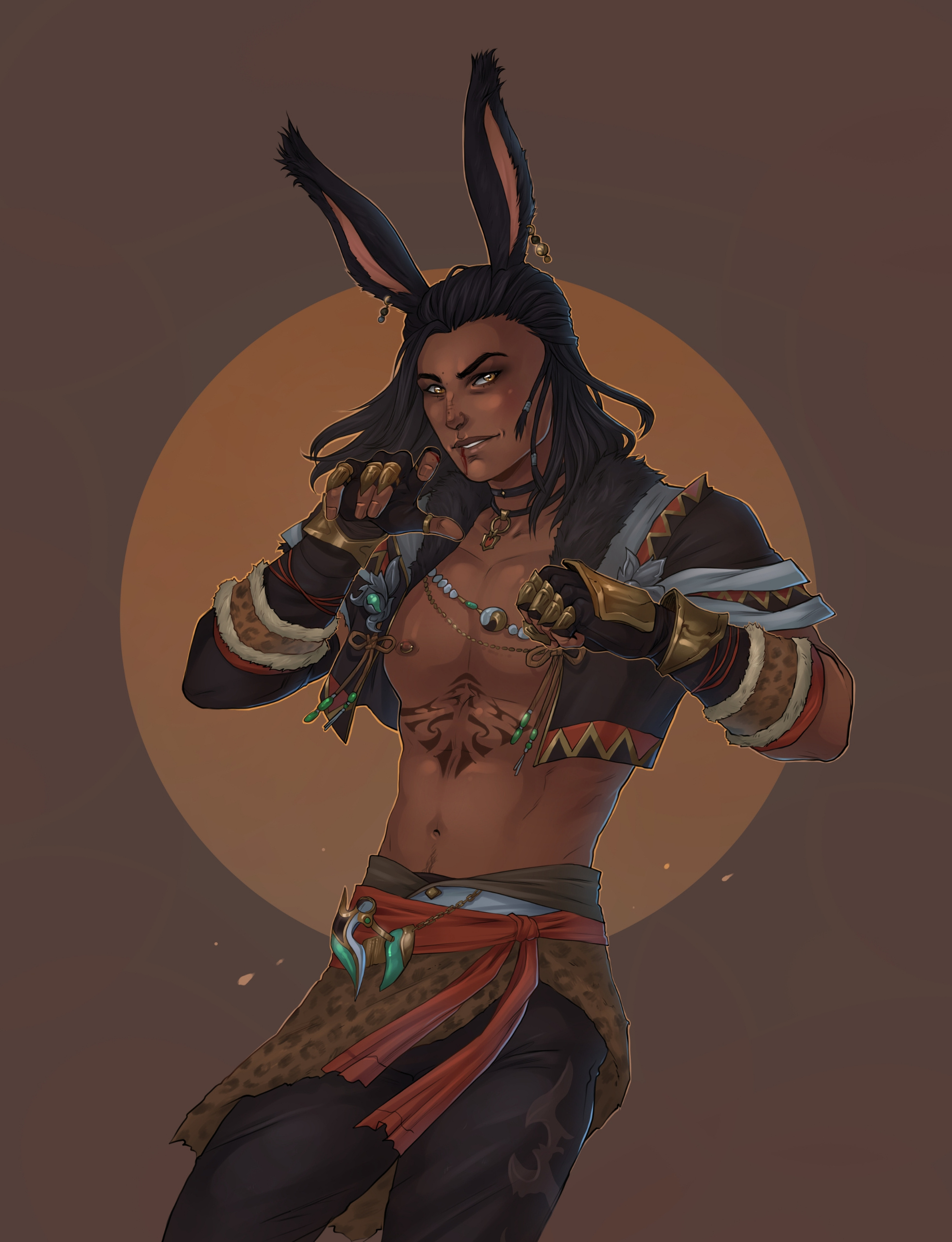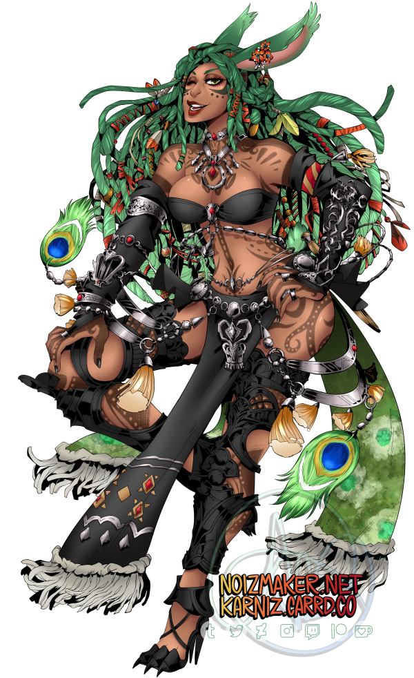 Hjthen was born to a Veena tribe on the edge of the forest at the base of the Skatay Range. His childhood was unremarkable; he learned to hunt, craft, and generally survive as most Vieran children do, and when he was discovered as male in his teens, he was given to a visiting Warder to begin his training. That, too, was unremarkable, save for the realization that life in solitude did not suit him at all. He became depressed and irritable without the sort of social contact he craved, and while the latter was very good for defending his territory, the former was not very good for much of anything else.When he was of age, he began his returns to the village that his territory bordered for breeding, but even that did little to alleviate the loneliness. He and his mentor rarely saw each other once he was able to roam his territory, though when they met, they often spent a night together, swapping information and sharing a meal, and allowing each other a bit more rest than normal by guarding the other for parts of the night. Those were the better nights, until a chance encounter that turned his fortunes one day in the heat of the summer along his territory’s border.Between his territory and the Golmore Jungle, there was a bit of land that was not roamed by any Warder, Rava or Veena, where the trees began to thicken into the denser growth of the Jungle, the clime not the cooler notes of the Skatay Range’s foothills nor the wet heat of Golmore’s heartwood. It was there, where he usually saw nothing, that he spied a slight blonde Rava slipping through the trees. He had never seen a Rava traversing these Warder-less lands, so he followed along the edge of his own territory until it ended and he lost sight of the mysterious visitor. This happened several more times in the moons that followed, until one day he put himself in their path, and discovered several things: The Rava was a Warder named Sascha, whose territory was just on the other side of the Warder-less lands. He travelled these lands to visit his twin brother, Endellion. Shortly after that first meeting they started a love-affair, and he fell for both Sascha and Endellion.Endellion found him one day and informed him that Sascha was leaving the Wood, and Hjthen tried to go to his territory only to find that he was already gone. The remaining two Viera decided to give it half a moon to see if he would come back to his senses and return home, but when the time came and went, Endellion grew worried and left to find his twin. Kismet ended up alone once more, and the turns that followed the disappearance of the twins were the worst he’d faced. When he decided he, too, would leave to find them, it was six turns into their disappearance.He traveled first through Yanxia and across the Ruby sea to Kugane, where he learned that the twins had passed through separately. He stowed away on a merchant ship and ended up in Thavnair without anything but the clothes on his back, and tried to make a home of the jungle while he questioned the locals, but ended up injured and ill. In the moons that followed, he recovered under the care of a kind alchemist, and spent more than a turn repaying her kindness by doing odd jobs, eventually saving her business from collapse when she took ill and needed time to recover. She began to call him Kismet, and he liked it enough that he made it into the name he gave to everyone he met.From Thavnair, Kismet booked passage to Eorzea, and began his search for the twins anew. When he reconnected with Sascha, he went by the name Anzhi, and was happily married to a Miqo’te. Heartbroken, he tried to make other connections, but none of them panned out. Eventually Anzhi and Kismet, with Anzhi’s husband’s approval, got back together and started dating, and eventually were handfasted. Now he lives with Anzhi and his husband, working part-time as a bartender. He has only seen Endellion once since leaving the Wood, but is happy knowing he is alive and well.