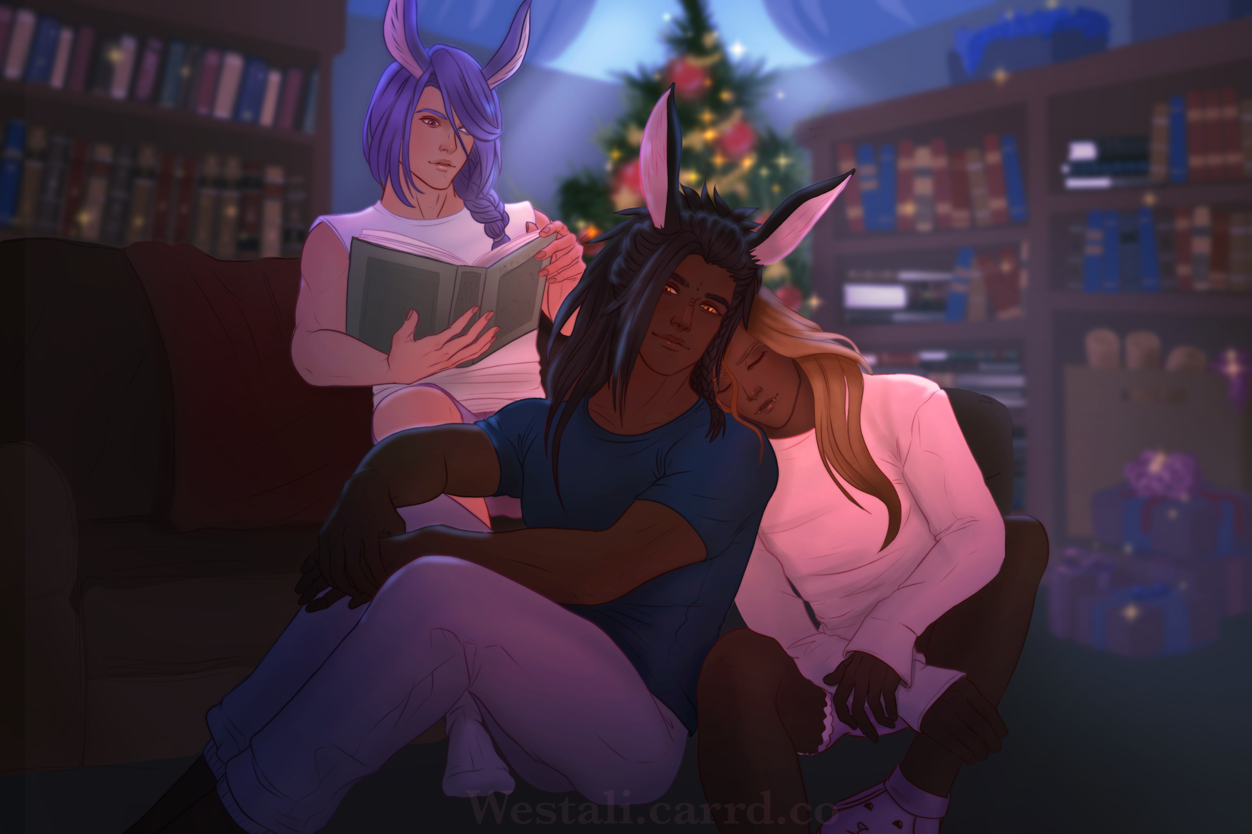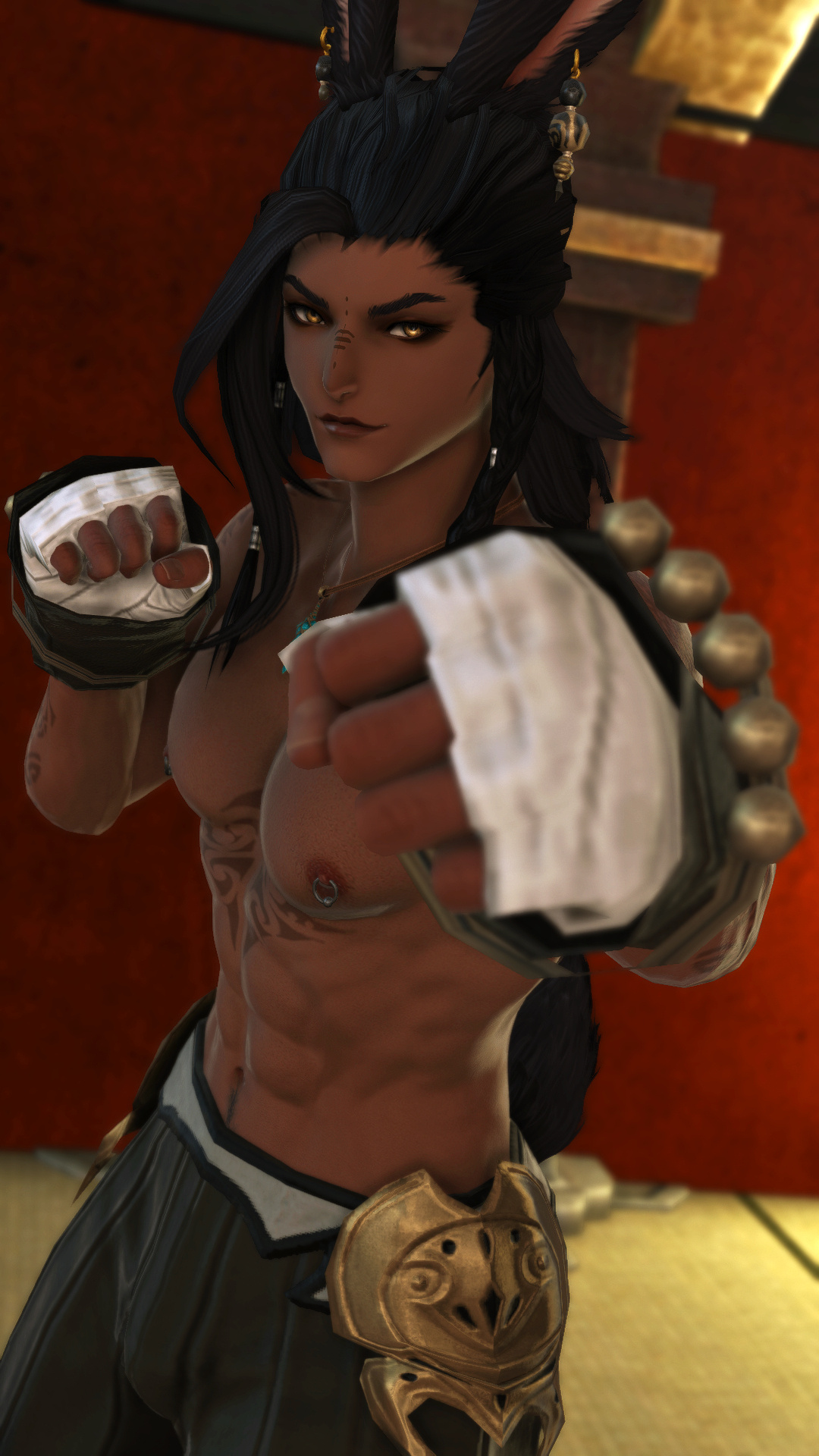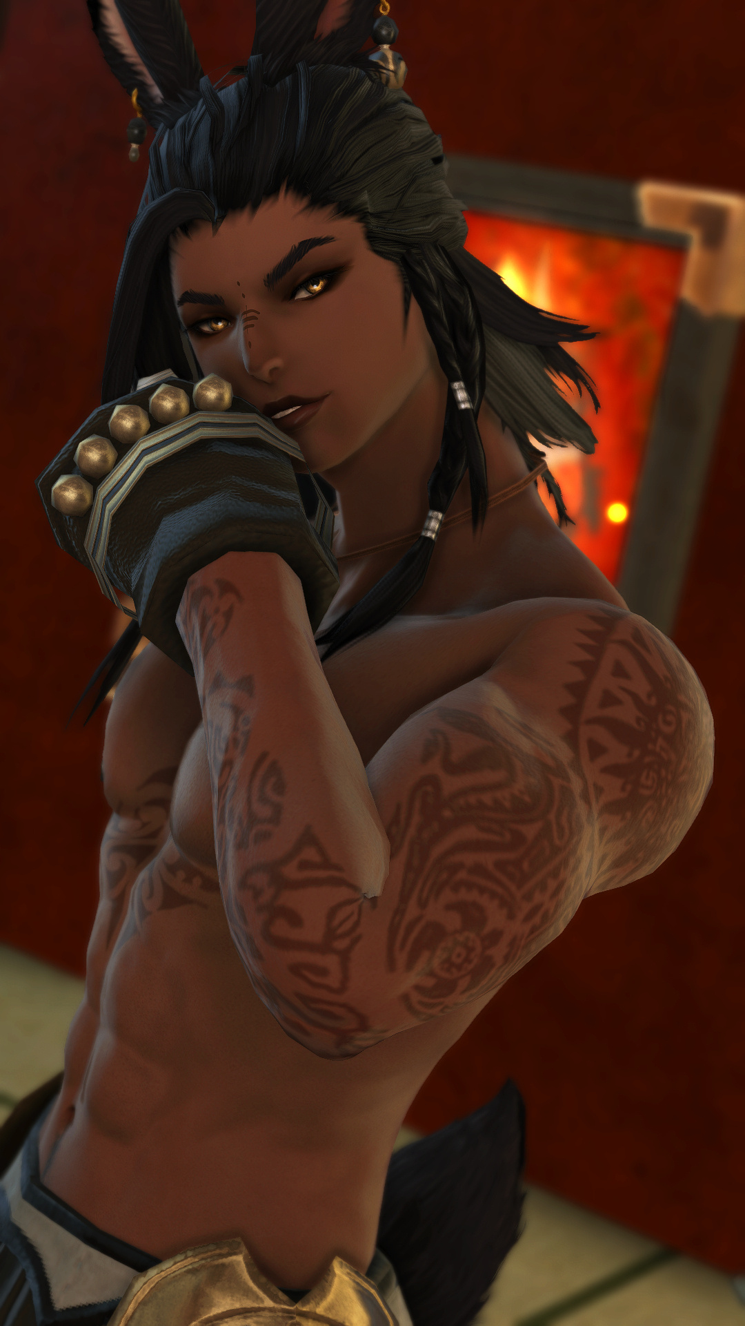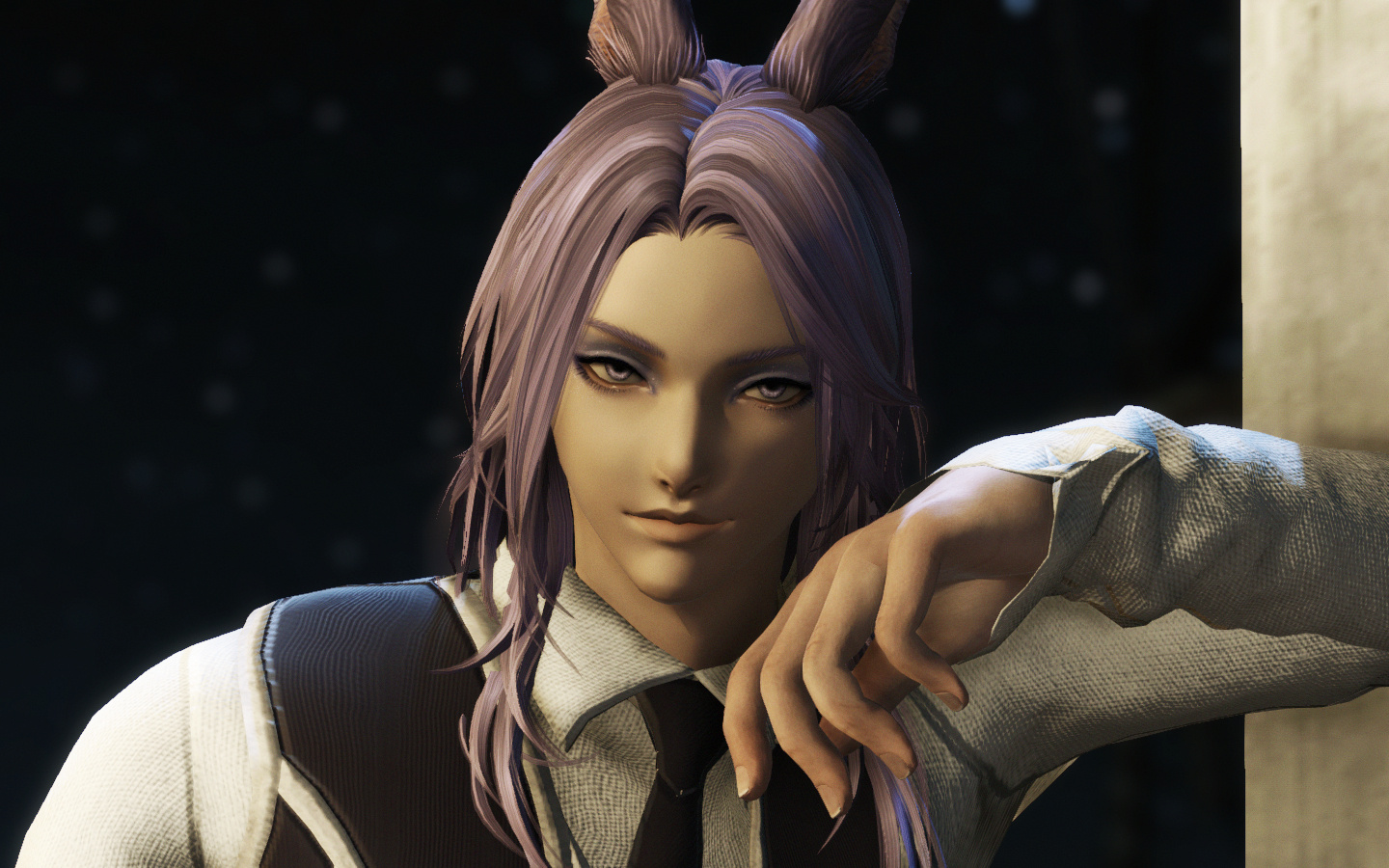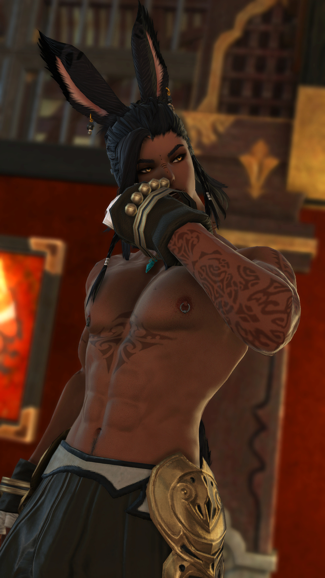 Hjthen was born to a Veena tribe on the edge of the forest at the base of the Skatay Range. His childhood was unremarkable; he learned to hunt, craft, and generally survive as most Vieran children do, and when he was discovered as male in his teens, he was given to a visiting Warder to begin his training. That, too, was unremarkable, save for the realization that life in solitude did not suit him at all. He became depressed and irritable without the sort of social contact he craved, and while the latter was very good for defending his territory, the former was not very good for much of anything else.When he was of age, he began his returns to the village that his territory bordered for breeding, but even that did little to alleviate the loneliness. He and his mentor rarely saw each other once he was able to roam his territory, though when they met, they often spent a night together, swapping information and sharing a meal, and allowing each other a bit more rest than normal by guarding the other for parts of the night. Those were the better nights, until a chance encounter that turned his fortunes one day in the heat of the summer along his territory’s border.Between his territory and the Golmore Jungle, there was a bit of land that was not roamed by any Warder, Rava or Veena, where the trees began to thicken into the denser growth of the Jungle, the clime not the cooler notes of the Skatay Range’s foothills nor the wet heat of Golmore’s heartwood. It was there, where he usually saw nothing, that he spied a slight blonde Rava slipping through the trees. He had never seen a Rava traversing these Warder-less lands, so he followed along the edge of his own territory until it ended and he lost sight of the mysterious visitor. This happened several more times in the moons that followed, until one day he put himself in their path, and discovered several things: The Rava was a Warder named Sascha, whose territory was just on the other side of the Warder-less lands. He travelled these lands to visit his twin brother, Endellion. Shortly after that first meeting they started a love-affair, and he fell for both Sascha and Endellion.Endellion found him one day and informed him that Sascha was leaving the Wood, and Hjthen tried to go to his territory only to find that he was already gone. The remaining two Viera decided to give it half a moon to see if he would come back to his senses and return home, but when the time came and went, Endellion grew worried and left to find his twin. Kismet ended up alone once more, and the turns that followed the disappearance of the twins were the worst he’d faced. When he decided he, too, would leave to find them, it was six turns into their disappearance.He traveled first through Yanxia and across the Ruby sea to Kugane, where he learned that the twins had passed through separately. He stowed away on a merchant ship and ended up in Thavnair without anything but the clothes on his back, and tried to make a home of the jungle while he questioned the locals, but ended up injured and ill. In the moons that followed, he recovered under the care of a kind alchemist, and spent more than a turn repaying her kindness by doing odd jobs, eventually saving her business from collapse when she took ill and needed time to recover. She began to call him Kismet, and he liked it enough that he made it into the name he gave to everyone he met.From Thavnair, Kismet booked passage to Eorzea, and began his search for the twins anew. When he reconnected with Sascha, he went by the name Anzhi, and was happily married to a Miqo’te. Heartbroken, he tried to make other connections, but none of them panned out. Eventually Anzhi and Kismet, with Anzhi’s husband’s approval, got back together and started dating, and eventually were handfasted. Now he lives with Anzhi and his husband, working part-time as a bartender. He has only seen Endellion once since leaving the Wood, but is happy knowing he is alive and well.