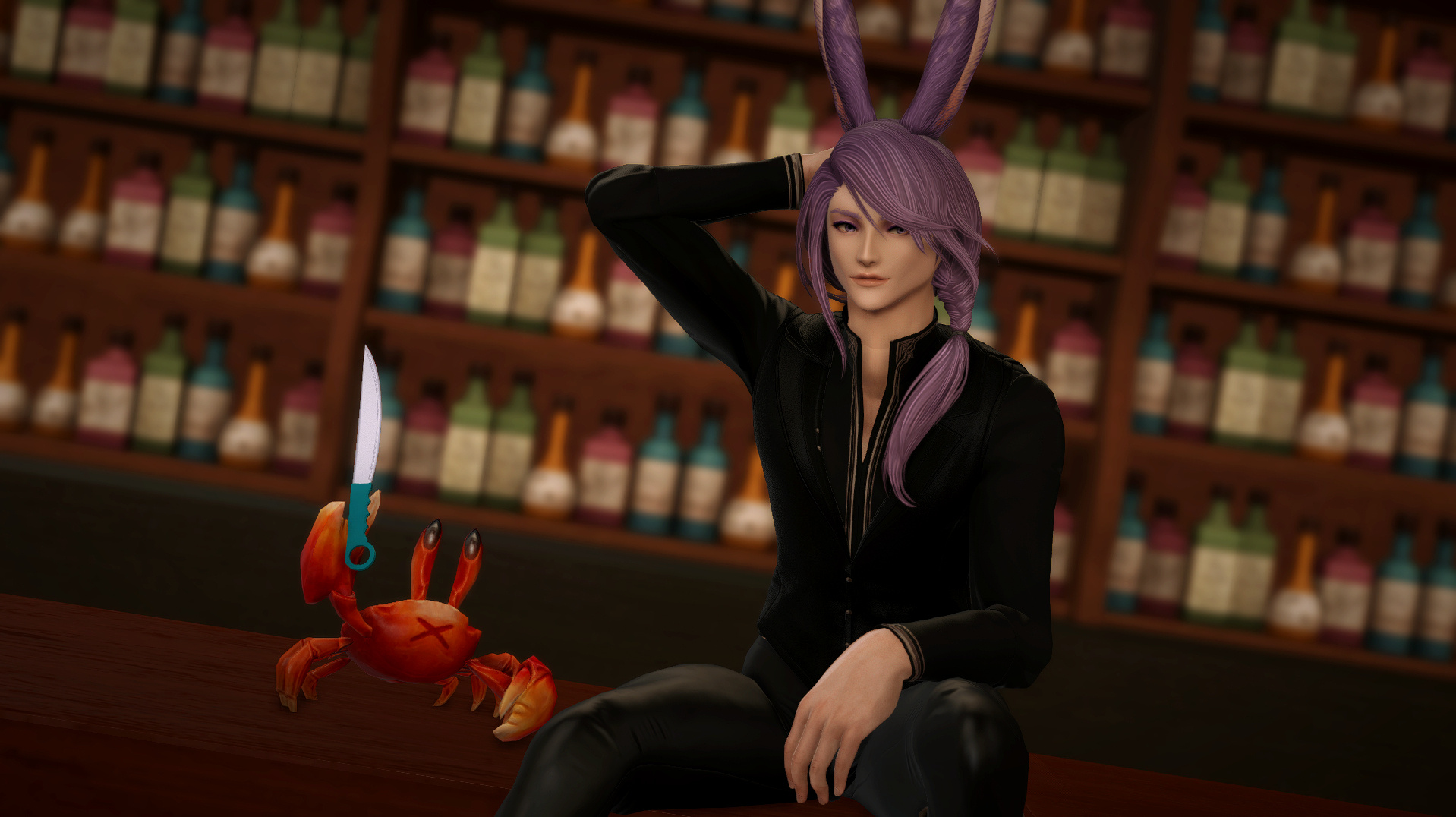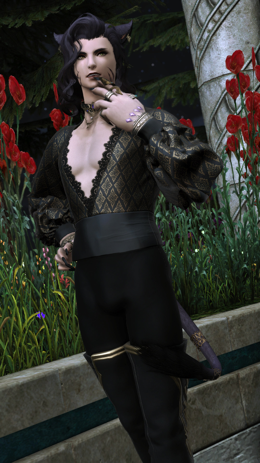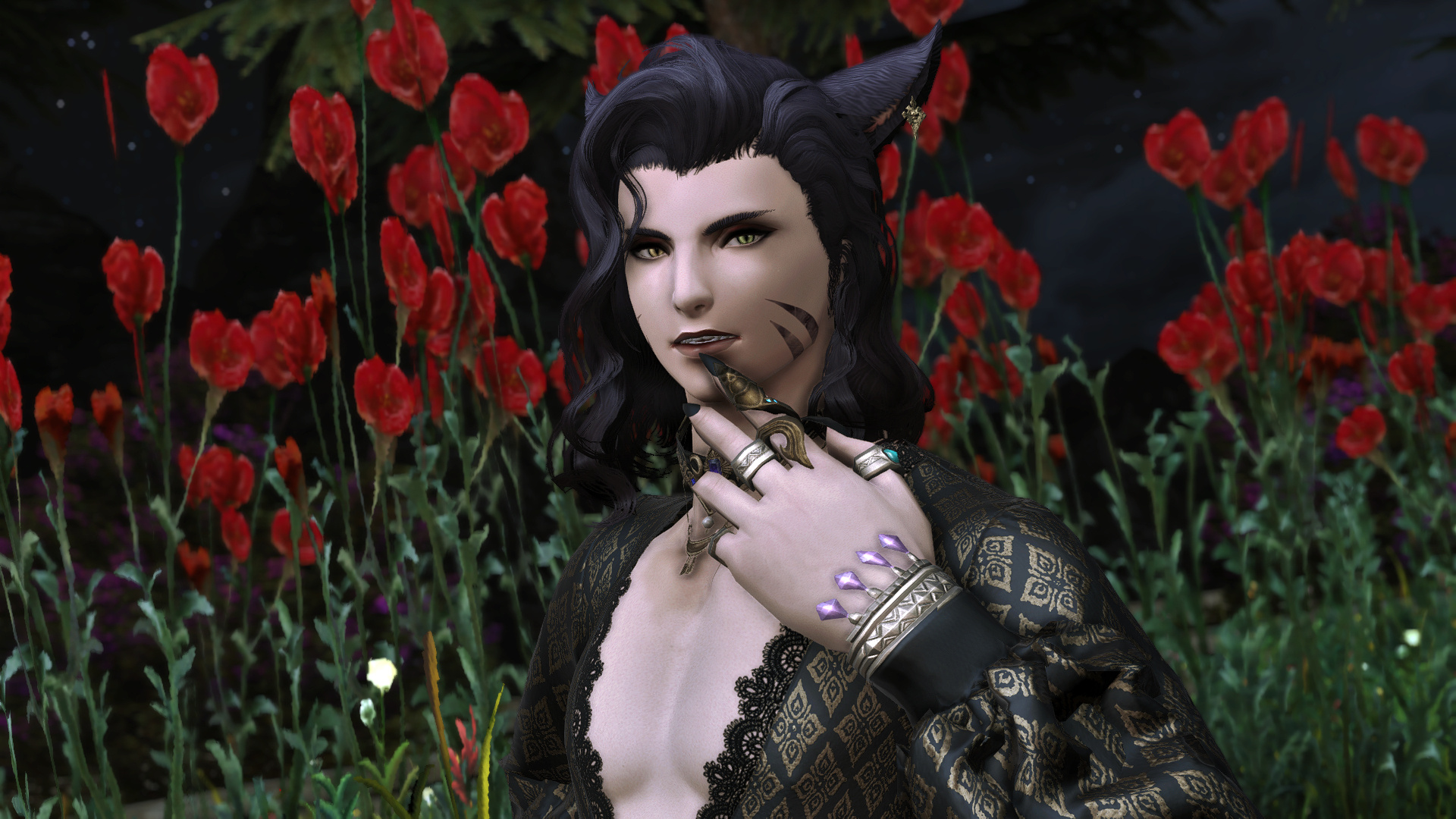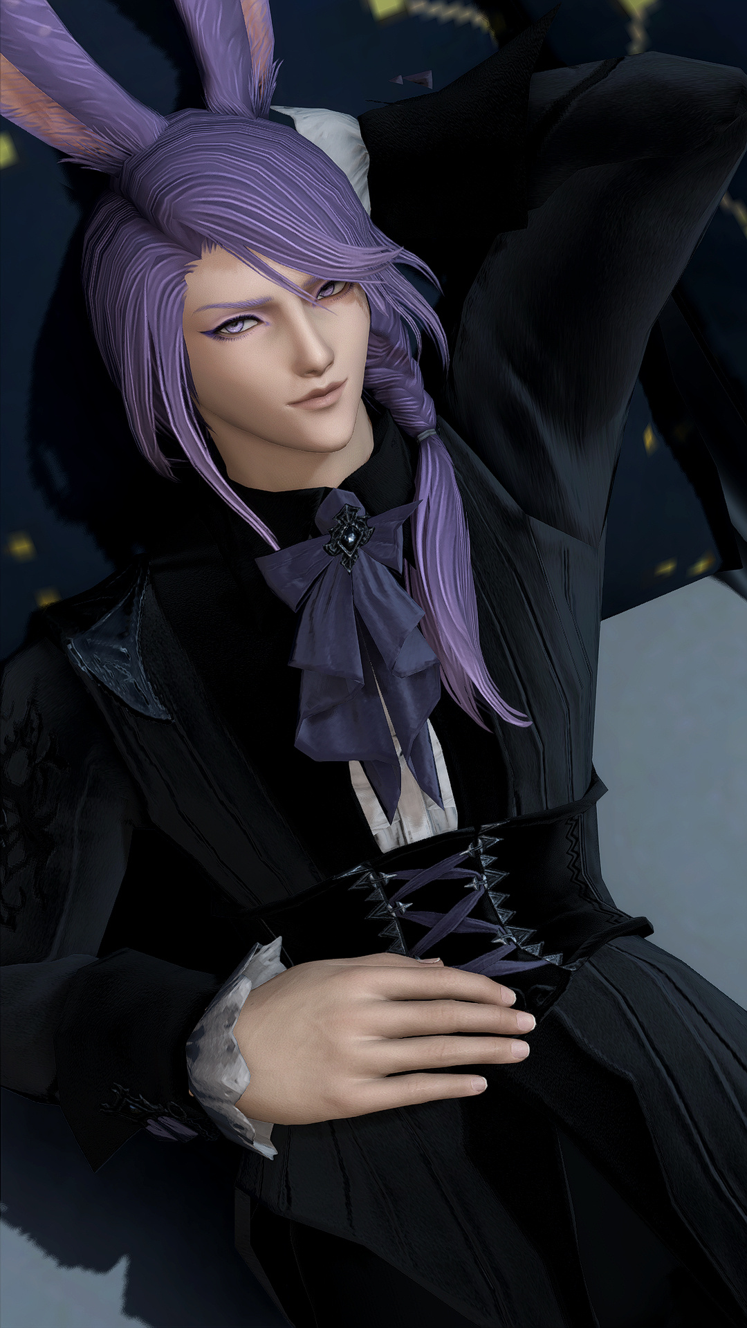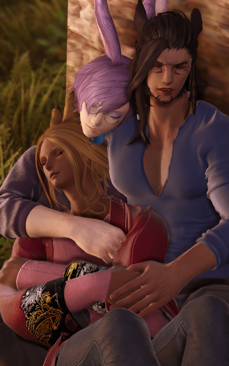 Hjthen was born to a Veena tribe on the edge of the forest at the base of the Skatay Range. His childhood was unremarkable; he learned to hunt, craft, and generally survive as most Vieran children do, and when he was discovered as male in his teens, he was given to a visiting Warder to begin his training. That, too, was unremarkable, save for the realization that life in solitude did not suit him at all. He became depressed and irritable without the sort of social contact he craved, and while the latter was very good for defending his territory, the former was not very good for much of anything else.When he was of age, he began his returns to the village that his territory bordered for breeding, but even that did little to alleviate the loneliness. He and his mentor rarely saw each other once he was able to roam his territory, though when they met, they often spent a night together, swapping information and sharing a meal, and allowing each other a bit more rest than normal by guarding the other for parts of the night. Those were the better nights, until a chance encounter that turned his fortunes one day in the heat of the summer along his territory’s border.Between his territory and the Golmore Jungle, there was a bit of land that was not roamed by any Warder, Rava or Veena, where the trees began to thicken into the denser growth of the Jungle, the clime not the cooler notes of the Skatay Range’s foothills nor the wet heat of Golmore’s heartwood. It was there, where he usually saw nothing, that he spied a slight blonde Rava slipping through the trees. He had never seen a Rava traversing these Warder-less lands, so he followed along the edge of his own territory until it ended and he lost sight of the mysterious visitor. This happened several more times in the moons that followed, until one day he put himself in their path, and discovered several things: The Rava was a Warder named Sascha, whose territory was just on the other side of the Warder-less lands. He travelled these lands to visit his twin brother, Endellion. Shortly after that first meeting they started a love-affair, and he fell for both Sascha and Endellion.Endellion found him one day and informed him that Sascha was leaving the Wood, and Hjthen tried to go to his territory only to find that he was already gone. The remaining two Viera decided to give it half a moon to see if he would come back to his senses and return home, but when the time came and went, Endellion grew worried and left to find his twin. Kismet ended up alone once more, and the turns that followed the disappearance of the twins were the worst he’d faced. When he decided he, too, would leave to find them, it was six turns into their disappearance.He traveled first through Yanxia and across the Ruby sea to Kugane, where he learned that the twins had passed through separately. He stowed away on a merchant ship and ended up in Thavnair without anything but the clothes on his back, and tried to make a home of the jungle while he questioned the locals, but ended up injured and ill. In the moons that followed, he recovered under the care of a kind alchemist, and spent more than a turn repaying her kindness by doing odd jobs, eventually saving her business from collapse when she took ill and needed time to recover. She began to call him Kismet, and he liked it enough that he made it into the name he gave to everyone he met.From Thavnair, Kismet booked passage to Eorzea, and began his search for the twins anew. When he reconnected with Sascha, he went by the name Anzhi, and was happily married to a Miqo’te. Heartbroken, he tried to make other connections, but none of them panned out. Eventually Anzhi and Kismet, with Anzhi’s husband’s approval, got back together and started dating, and eventually were handfasted. Now he lives with Anzhi and his husband, working part-time as a bartender. He has only seen Endellion once since leaving the Wood, but is happy knowing he is alive and well.