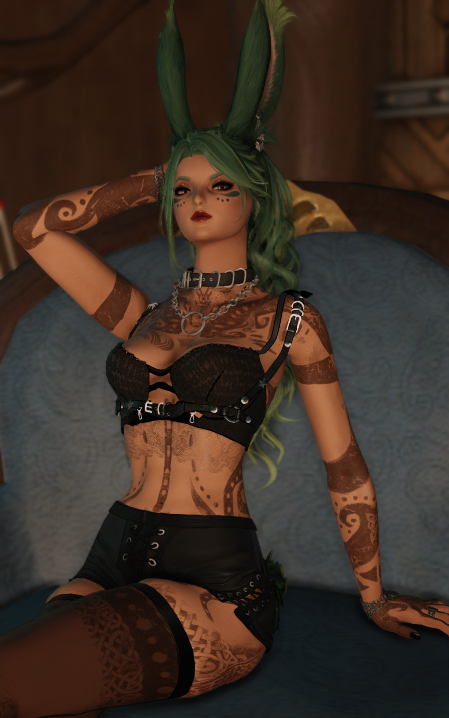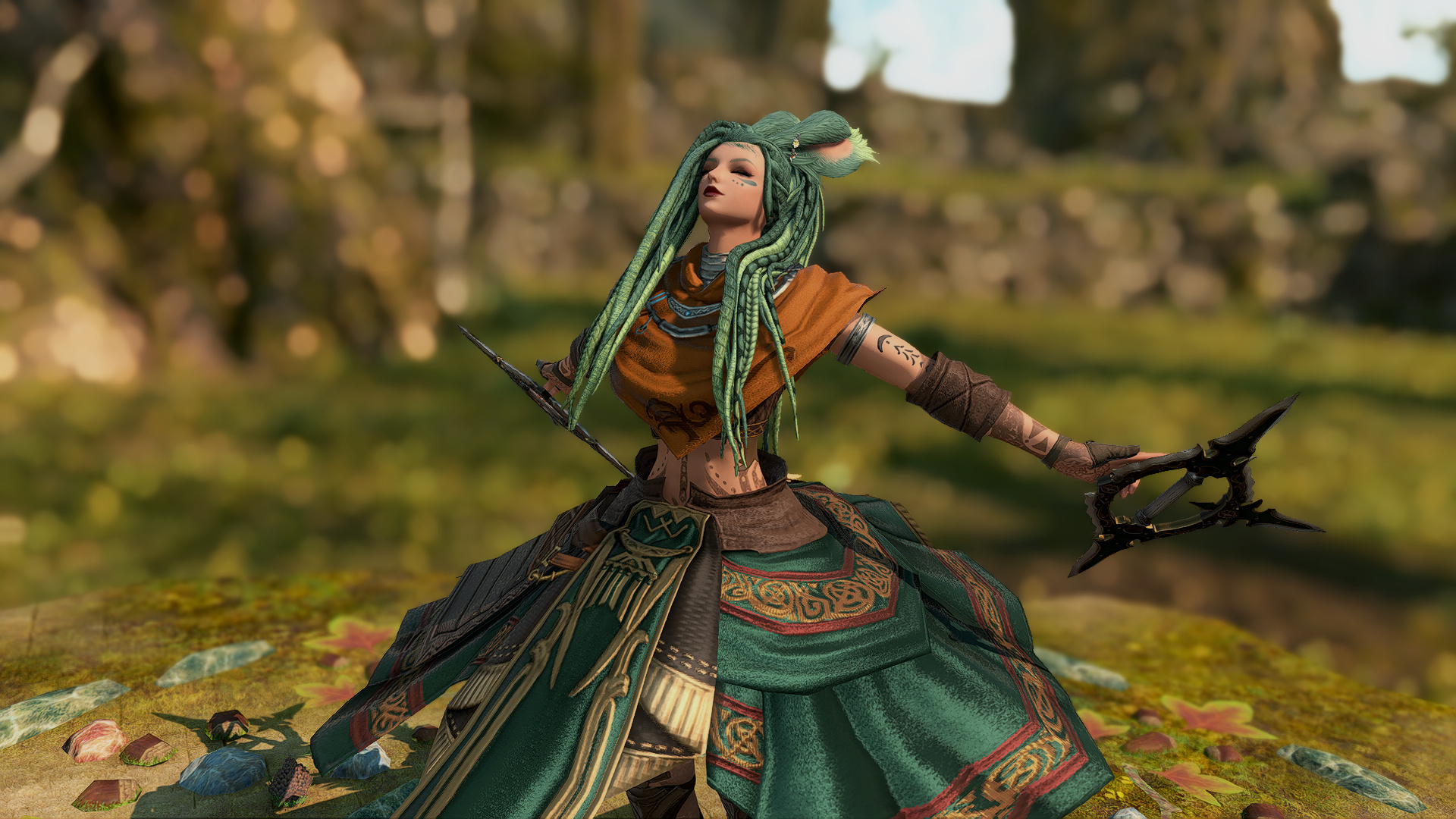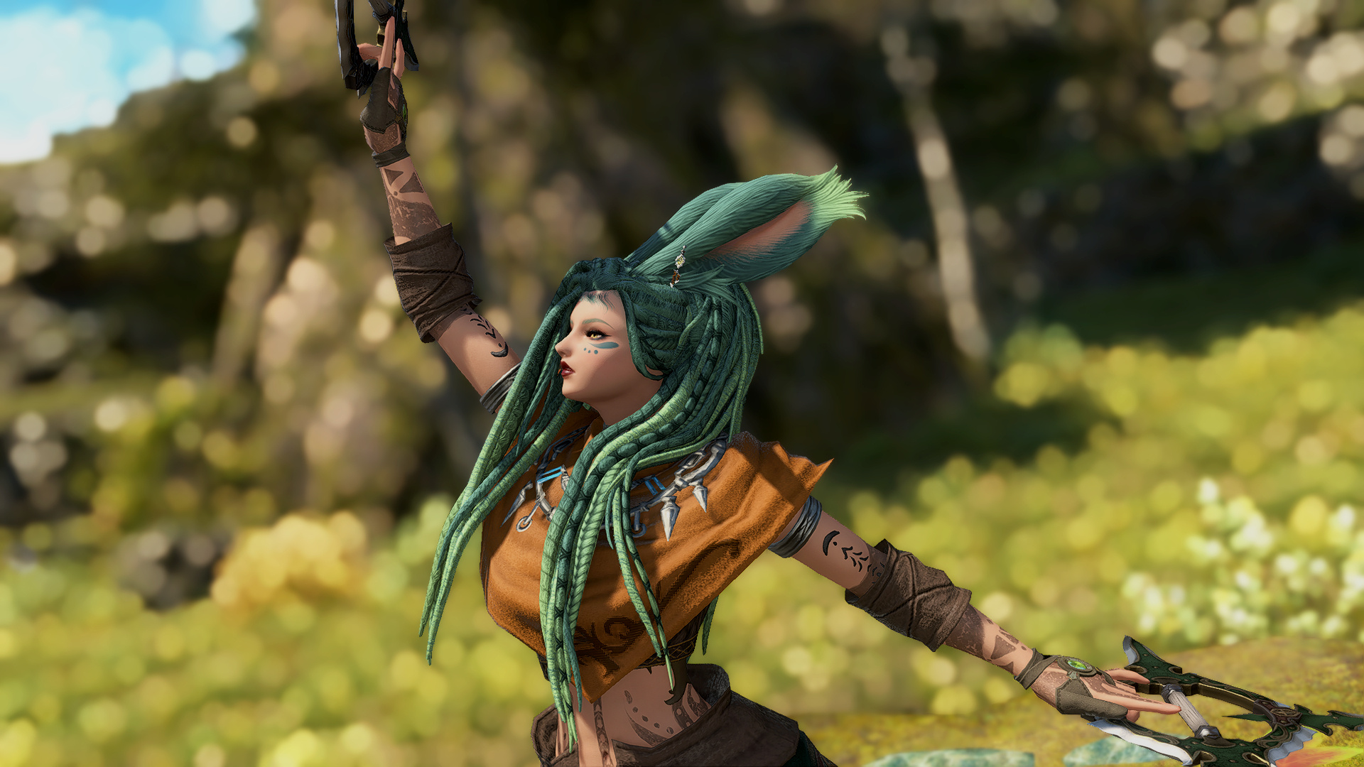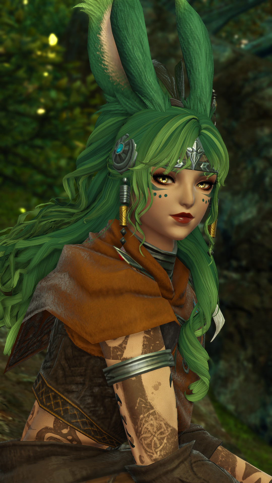 In the village of Hyskaris in the Golmore Jungle, there was a woman who was held in high esteem among her people. Her name was Krjn, and she became over the course of her long life the one who trained several generations of Viera hunters and fighters. She had five children--two sons and three daughters. Of these children, Schala was born second.Having an elder sister to look up to and compete with was what drove Schala to excel in combat. The pair of them trained, sparred, and hunted together, and eventually shared the responsibility with the rest of the village of rearing children and training them with their mother. Even long after she came of age she failed to take an interest in any of the males that came around past friendly interactions, and so it came to be that by the time she was in her eighties and most of the women her age had children and grandchildren, Schala had none of her own. Instead, Schala had elected to hone her skills and defend their home from outside threats.Most agreed that Schala could have been right at home living the life of a Wood Warder, for all that she enjoyed her solitary hunts and wanderings, and there was a time when she considered joining the men on the fringes and leaving village life behind. Schala's tendency for ranging outside the bounds of her village took her further and further away over the turns, and it was on one such long-range wandering that she happened upon an old, injured Wood Warder embroiled in what appeared to be a protracted engagement with a small group of men in armor. Without thinking, she jumped in to help him, and together the two managed to dispatch the invaders.That was her first experience with outsiders.When she returned to her village, she tried to warn her elders of the dangers they could soon be facing if the men were growing brave enough to send in scouting parties, but was met with inaction and dismissal. Frustrated, she began to range further and more often, and began interacting with the Wood Warders she found along the way to keep tabs on the situation. It seemed it wasn't the first incursion, and was not expected to be the last.When next Shieke saw the old Wood Warder he was not alone, but paired with another Viera male who, upon meeting Schala, became aggressive toward her. It took time and repeated meetings for her to finally confront the man alone, and when she did it was not with words, but with blades. That was how Schala came to know Xjnn Djt-Bidit, who soundly and coldly defeated her in single combat. This was also how Schala met the man who would go on to sire all four of her children.Over the turns the pair met often, though most of the time only to exchange information or spar after they'd agreed to put their initial conflict behind them. There was never more than a mutual respect and close friendship between them, but it was enough that he was the only male she allowed to touch her, and she was the only one he felt he could trust with his lineage. Over the next half century, the pair had four children, two boys and two girls. The males trained under him when they came of age, and the girls stayed with Schala and the village. Over time, her children had children of their own, and her family flourished.When Garlemald pushed into Dalmasca, Xjnn was one of the unfortunate Wood Warders to be lost to smaller invading Garlean parties. When Schala found him, she recruited her brothers and tracked and ambushed his killers, but it was not enough. Others had met their ends at the hands of the metal men, and once Schala had helped clear out the braver parties she decided that it was time to take the fight to them.When Schala left her home, she took on the name "Shieke" and linked up with the Bozjan Resistance and the few Vieran brothers and sisters who had also come out of the jungle to fight. It was there that she remained until the IVth Legion withdrew. As she had voluntarily left the Wood, she would not be allowed back, so she traveled to Kugane and took a ship to Eorzea. If she could not go back to her ancestral home, then the least she could do was travel as far and wide as she was able. What better way to enjoy retirement?