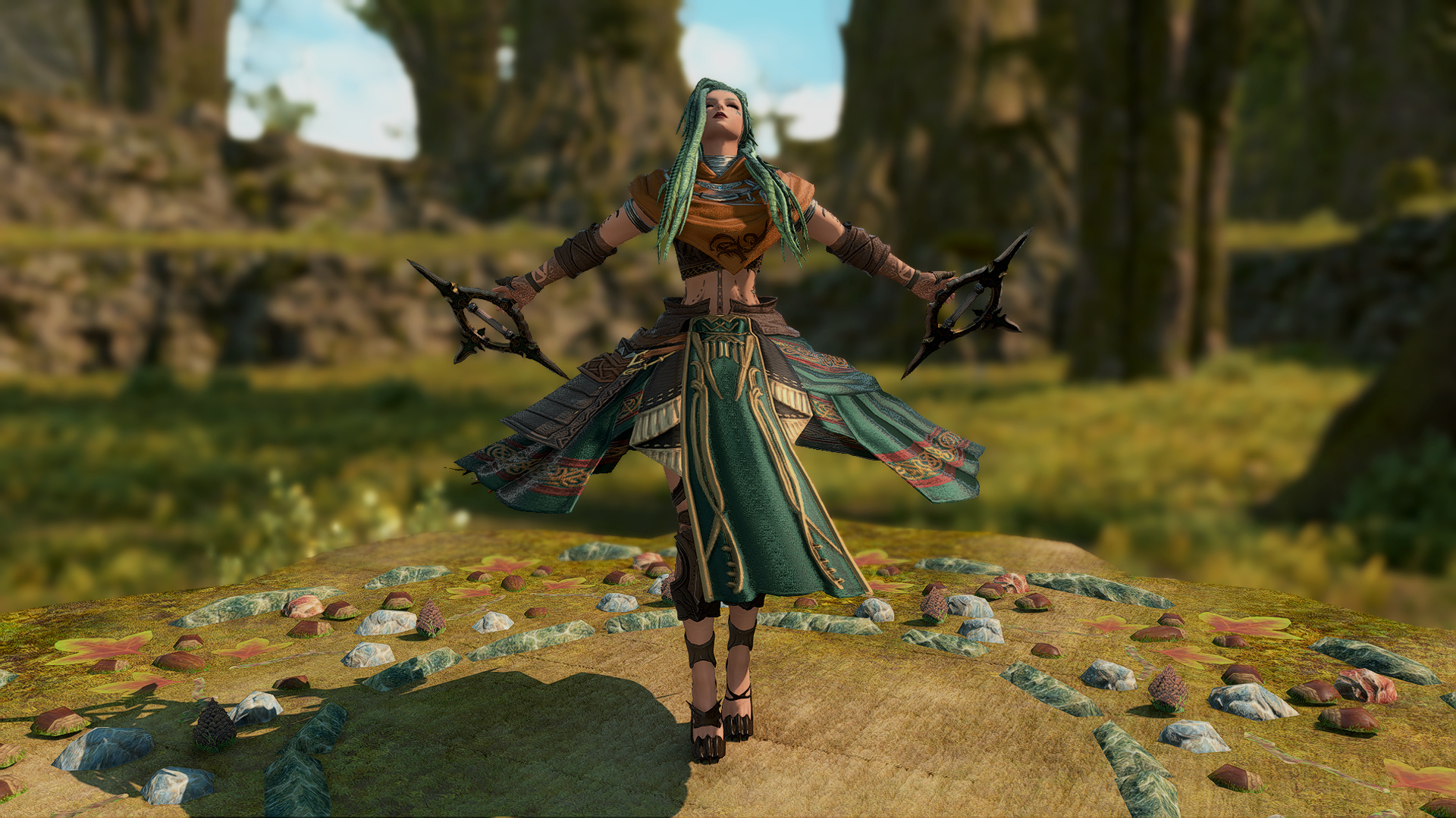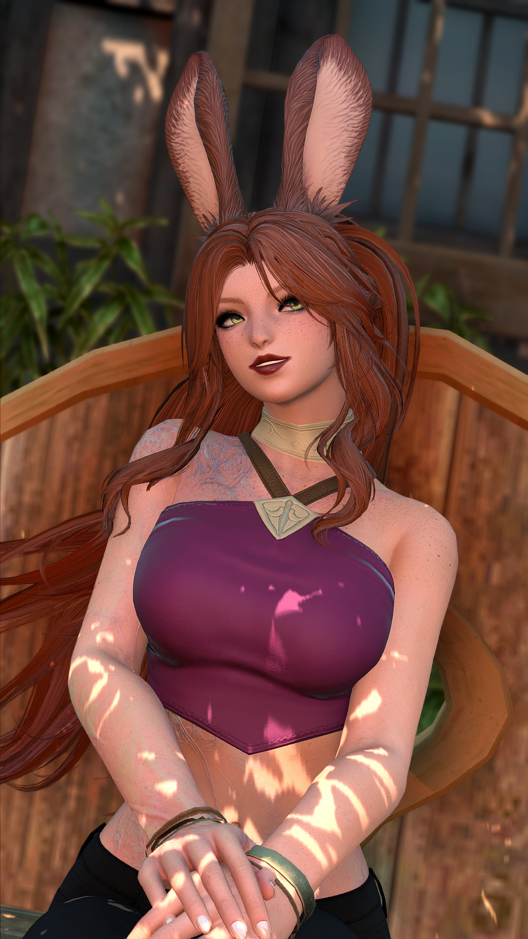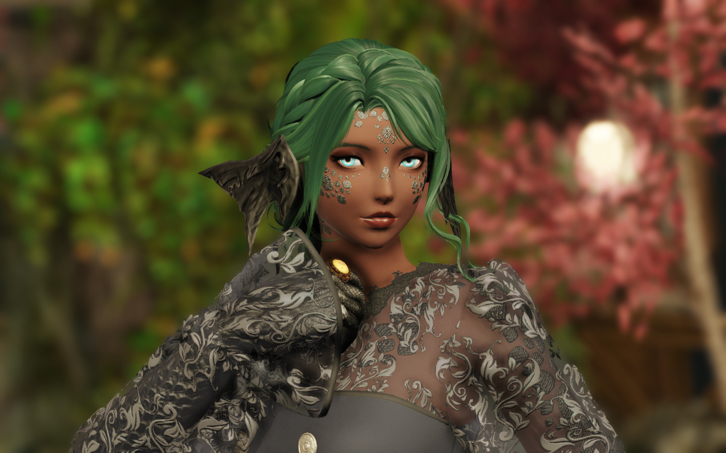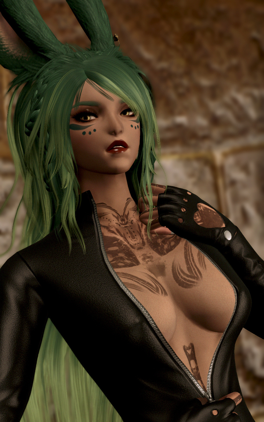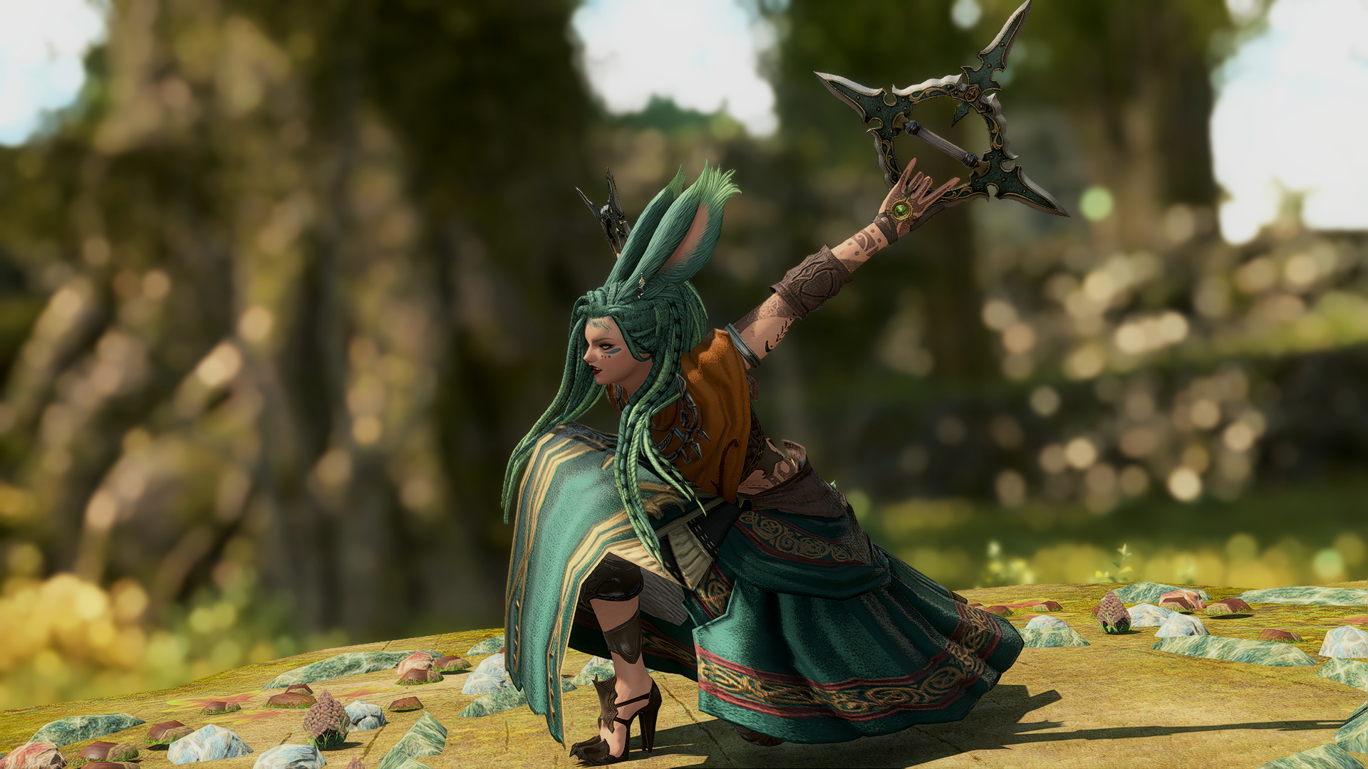 In the village of Hyskaris in the Golmore Jungle, there was a woman who was held in high esteem among her people. Her name was Krjn, and she became over the course of her long life the one who trained several generations of Viera hunters and fighters. She had five children--two sons and three daughters. Of these children, Schala was born second.Having an elder sister to look up to and compete with was what drove Schala to excel in combat. The pair of them trained, sparred, and hunted together, and eventually shared the responsibility with the rest of the village of rearing children and training them with their mother. Even long after she came of age she failed to take an interest in any of the males that came around past friendly interactions, and so it came to be that by the time she was in her eighties and most of the women her age had children and grandchildren, Schala had none of her own. Instead, Schala had elected to hone her skills and defend their home from outside threats.Most agreed that Schala could have been right at home living the life of a Wood Warder, for all that she enjoyed her solitary hunts and wanderings, and there was a time when she considered joining the men on the fringes and leaving village life behind. Schala's tendency for ranging outside the bounds of her village took her further and further away over the turns, and it was on one such long-range wandering that she happened upon an old, injured Wood Warder embroiled in what appeared to be a protracted engagement with a small group of men in armor. Without thinking, she jumped in to help him, and together the two managed to dispatch the invaders.That was her first experience with outsiders.When she returned to her village, she tried to warn her elders of the dangers they could soon be facing if the men were growing brave enough to send in scouting parties, but was met with inaction and dismissal. Frustrated, she began to range further and more often, and began interacting with the Wood Warders she found along the way to keep tabs on the situation. It seemed it wasn't the first incursion, and was not expected to be the last.When next Shieke saw the old Wood Warder he was not alone, but paired with another Viera male who, upon meeting Schala, became aggressive toward her. It took time and repeated meetings for her to finally confront the man alone, and when she did it was not with words, but with blades. That was how Schala came to know Xjnn Djt-Bidit, who soundly and coldly defeated her in single combat. This was also how Schala met the man who would go on to sire all four of her children.Over the turns the pair met often, though most of the time only to exchange information or spar after they'd agreed to put their initial conflict behind them. There was never more than a mutual respect and close friendship between them, but it was enough that he was the only male she allowed to touch her, and she was the only one he felt he could trust with his lineage. Over the next half century, the pair had four children, two boys and two girls. The males trained under him when they came of age, and the girls stayed with Schala and the village. Over time, her children had children of their own, and her family flourished.When Garlemald pushed into Dalmasca, Xjnn was one of the unfortunate Wood Warders to be lost to smaller invading Garlean parties. When Schala found him, she recruited her brothers and tracked and ambushed his killers, but it was not enough. Others had met their ends at the hands of the metal men, and once Schala had helped clear out the braver parties she decided that it was time to take the fight to them.When Schala left her home, she took on the name "Shieke" and linked up with the Bozjan Resistance and the few Vieran brothers and sisters who had also come out of the jungle to fight. It was there that she remained until the IVth Legion withdrew. As she had voluntarily left the Wood, she would not be allowed back, so she traveled to Kugane and took a ship to Eorzea. If she could not go back to her ancestral home, then the least she could do was travel as far and wide as she was able. What better way to enjoy retirement?