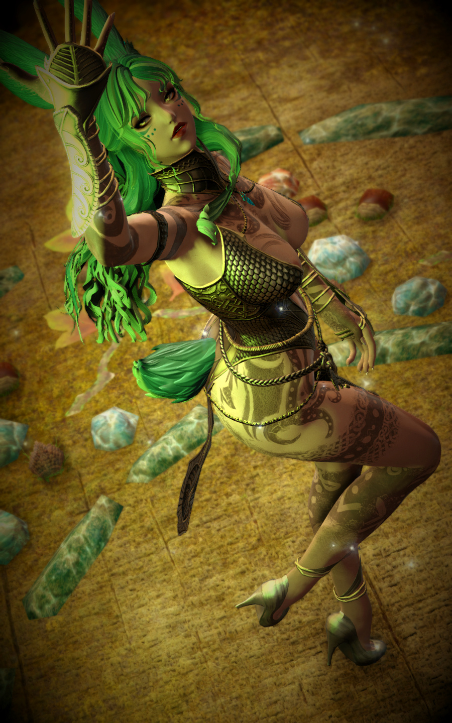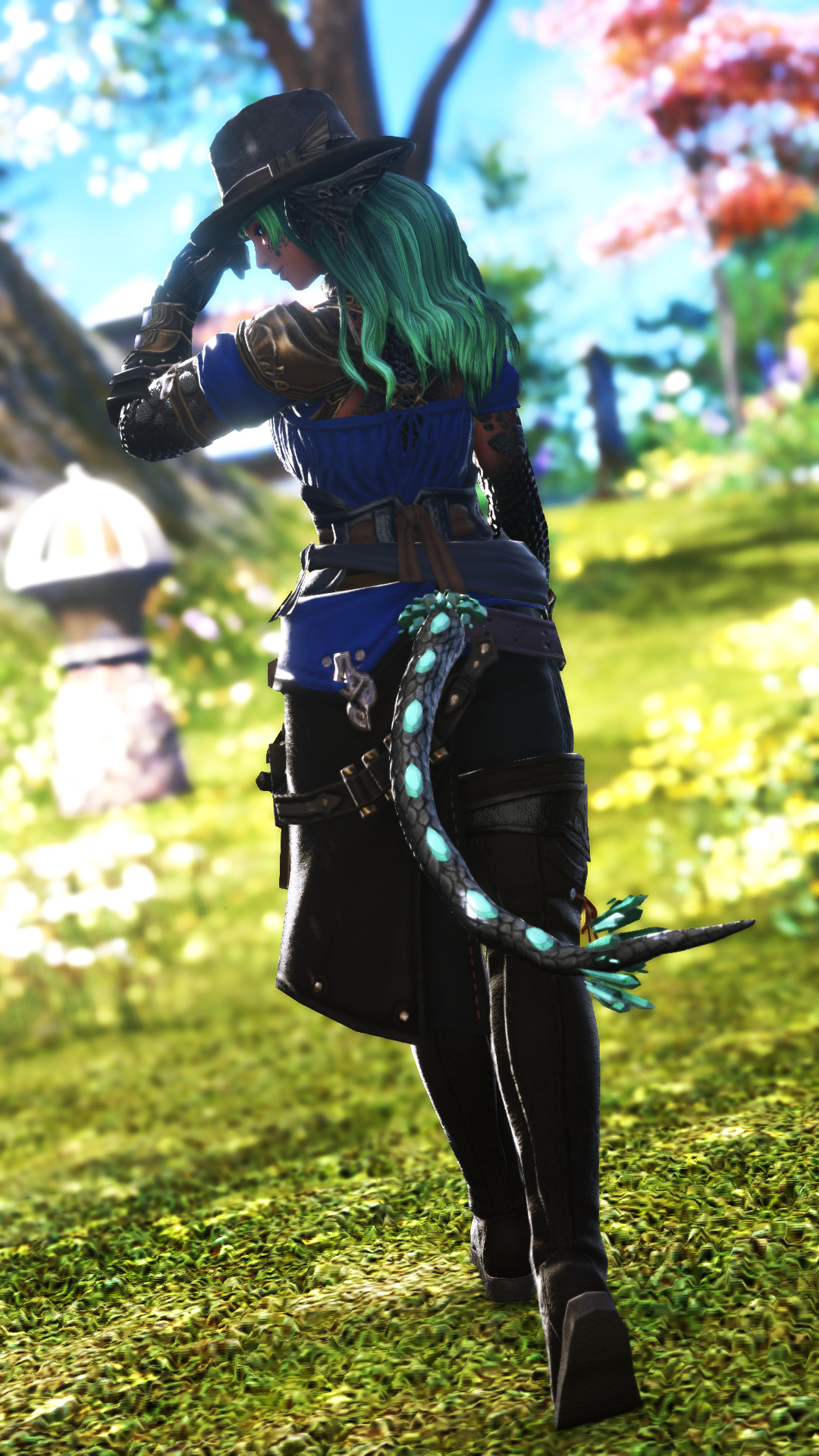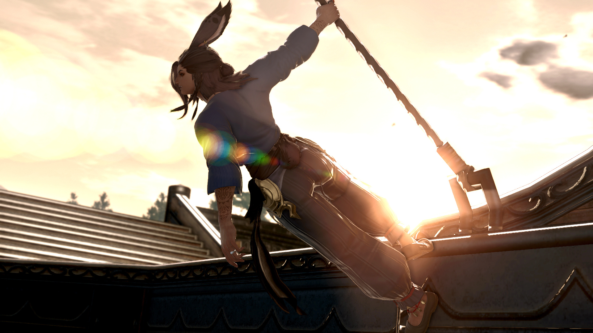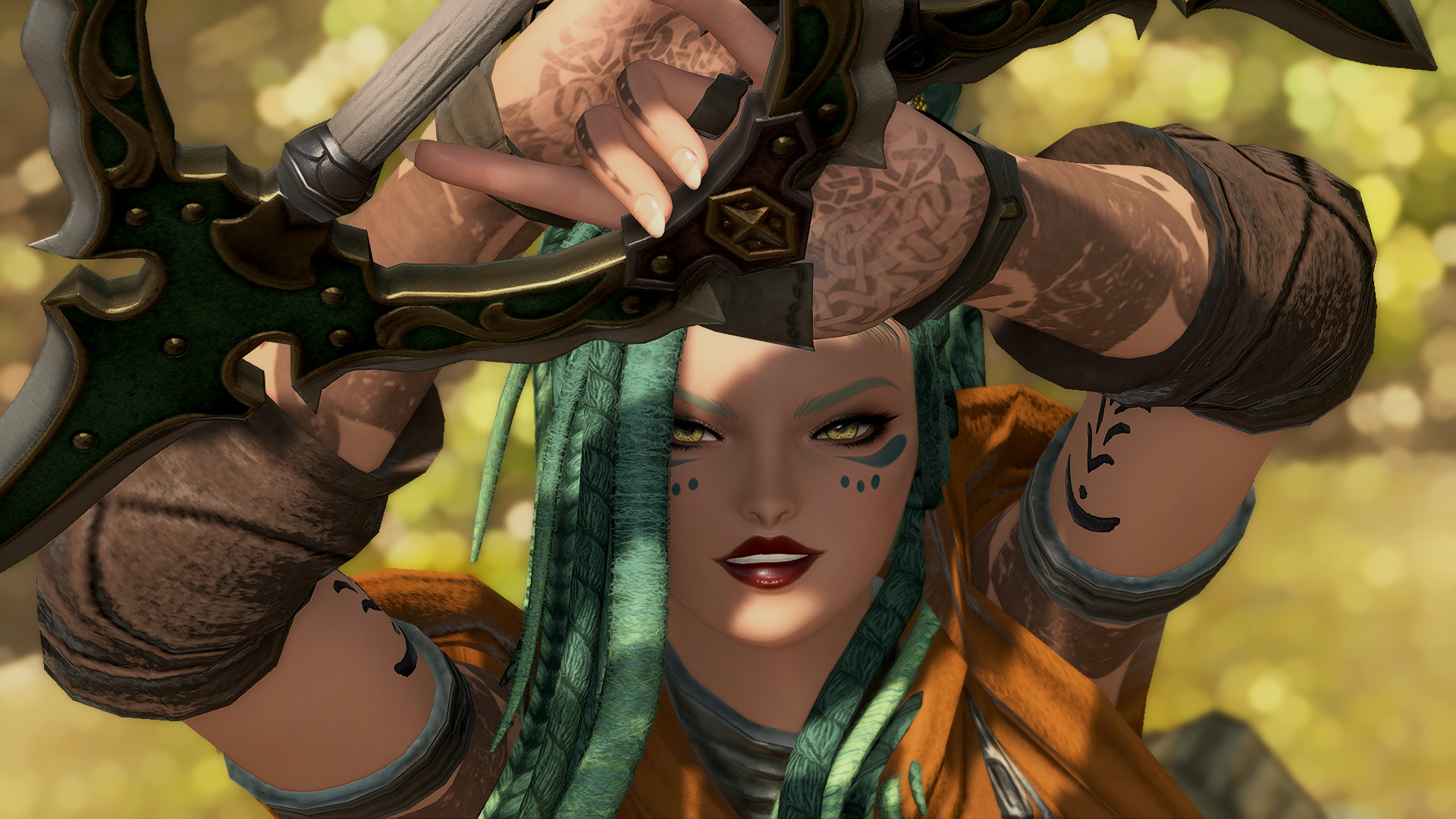 In the village of Hyskaris in the Golmore Jungle, there was a woman who was held in high esteem among her people. Her name was Krjn, and she became over the course of her long life the one who trained several generations of Viera hunters and fighters. She had five children--two sons and three daughters. Of these children, Schala was born second.Having an elder sister to look up to and compete with was what drove Schala to excel in combat. The pair of them trained, sparred, and hunted together, and eventually shared the responsibility with the rest of the village of rearing children and training them with their mother. Even long after she came of age she failed to take an interest in any of the males that came around past friendly interactions, and so it came to be that by the time she was in her eighties and most of the women her age had children and grandchildren, Schala had none of her own. Instead, Schala had elected to hone her skills and defend their home from outside threats.Most agreed that Schala could have been right at home living the life of a Wood Warder, for all that she enjoyed her solitary hunts and wanderings, and there was a time when she considered joining the men on the fringes and leaving village life behind. Schala's tendency for ranging outside the bounds of her village took her further and further away over the turns, and it was on one such long-range wandering that she happened upon an old, injured Wood Warder embroiled in what appeared to be a protracted engagement with a small group of men in armor. Without thinking, she jumped in to help him, and together the two managed to dispatch the invaders.That was her first experience with outsiders.When she returned to her village, she tried to warn her elders of the dangers they could soon be facing if the men were growing brave enough to send in scouting parties, but was met with inaction and dismissal. Frustrated, she began to range further and more often, and began interacting with the Wood Warders she found along the way to keep tabs on the situation. It seemed it wasn't the first incursion, and was not expected to be the last.When next Shieke saw the old Wood Warder he was not alone, but paired with another Viera male who, upon meeting Schala, became aggressive toward her. It took time and repeated meetings for her to finally confront the man alone, and when she did it was not with words, but with blades. That was how Schala came to know Xjnn Djt-Bidit, who soundly and coldly defeated her in single combat. This was also how Schala met the man who would go on to sire all four of her children.Over the turns the pair met often, though most of the time only to exchange information or spar after they'd agreed to put their initial conflict behind them. There was never more than a mutual respect and close friendship between them, but it was enough that he was the only male she allowed to touch her, and she was the only one he felt he could trust with his lineage. Over the next half century, the pair had four children, two boys and two girls. The males trained under him when they came of age, and the girls stayed with Schala and the village. Over time, her children had children of their own, and her family flourished.When Garlemald pushed into Dalmasca, Xjnn was one of the unfortunate Wood Warders to be lost to smaller invading Garlean parties. When Schala found him, she recruited her brothers and tracked and ambushed his killers, but it was not enough. Others had met their ends at the hands of the metal men, and once Schala had helped clear out the braver parties she decided that it was time to take the fight to them.When Schala left her home, she took on the name "Shieke" and linked up with the Bozjan Resistance and the few Vieran brothers and sisters who had also come out of the jungle to fight. It was there that she remained until the IVth Legion withdrew. As she had voluntarily left the Wood, she would not be allowed back, so she traveled to Kugane and took a ship to Eorzea. If she could not go back to her ancestral home, then the least she could do was travel as far and wide as she was able. What better way to enjoy retirement?