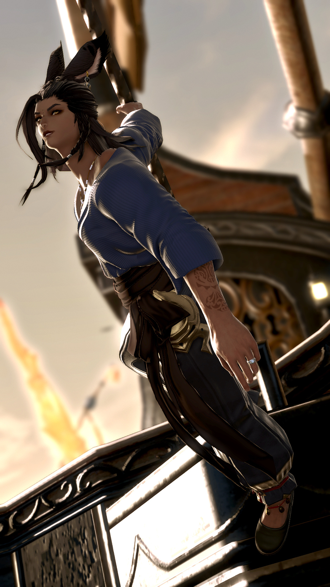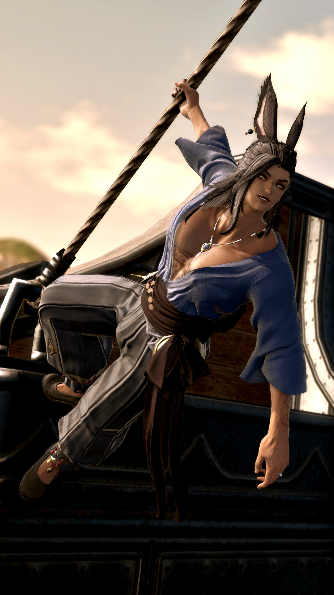 During his time working on a merchant sea vessel named The Illusion some four or five turns ago, he visited many different ports, and was often one of the crew loading and offloading cargo. Though his most frequent stops were in Thanalan and La Noscea, he has made port other places as well, such as Thavnair.