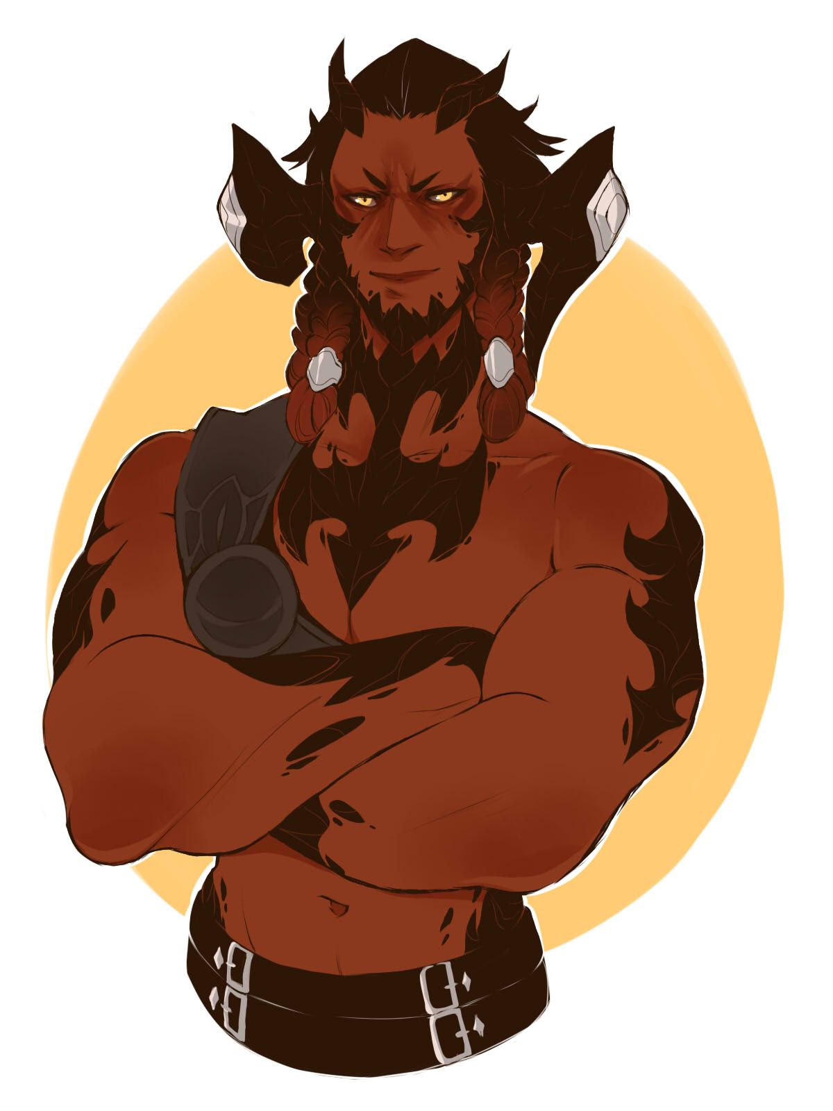 Saikhan Dotharl might have been the embodiment of his previous life—a warrior true, meant to come to the defense of his tribe with a fearless heart and a heavy draw—but fate is not always kind, and cruelty is often more commonplace on the Azim Steppe. Barely a child of two summers, he was instead lost to the Nhaama desert sands along with his parents, and all three were declared dead by their tribe. And though they were correct on two counts—his parents had died—he was found wandering near the mountains by a Raen woman who lived just beyond. Starving and badly dehydrated, the woman took him into her home and nursed him back to health.To her credit, she tried to take him back to the Steppe and find one of the tribes. Her intent had been to gather enough information that she could take him back to his home, but the ever-present danger of the Xaela dwelling there meant that she could not travel alone with him for long. When several trips to the Steppe came and went without successfully finding his tribe, the woman finally resolved to take Saikhan in as one of her own. The language barrier might have been enough to curb understanding, but paired with the often hard-to-translate speech of a toddler, she could not glean any clue as to his name. So she named him Hinan and gave him her surname, and he grew up alongside a Raen boy two summers his elder named Aeluan.Hinan and Aeluan were very close throughout their childhood despite the two-summer age gap, but there were some notable differences in their childhood experiences. Where Aeluan found it easy to make friends, Hinan found that the types of people that liked Aeluan were prone to judging others, and unfortunately Hinan was the odd man out in just about everything due to his Xaelic features. This was an unfortunate trend that continued into adulthood, and as a result, Hinan grew up with a moderate amount of social anxiety.When he eventually struck out on his own, he resolved to do a bit of travelling, to see if there was some other place he could go that might feel more welcoming, and he ended up taking mercenary work that took him to Vylbrand. It was there that he carved out a living with his axe and made a name for himself. The Demon of Vylbrand, they called him, but they only knew his face.